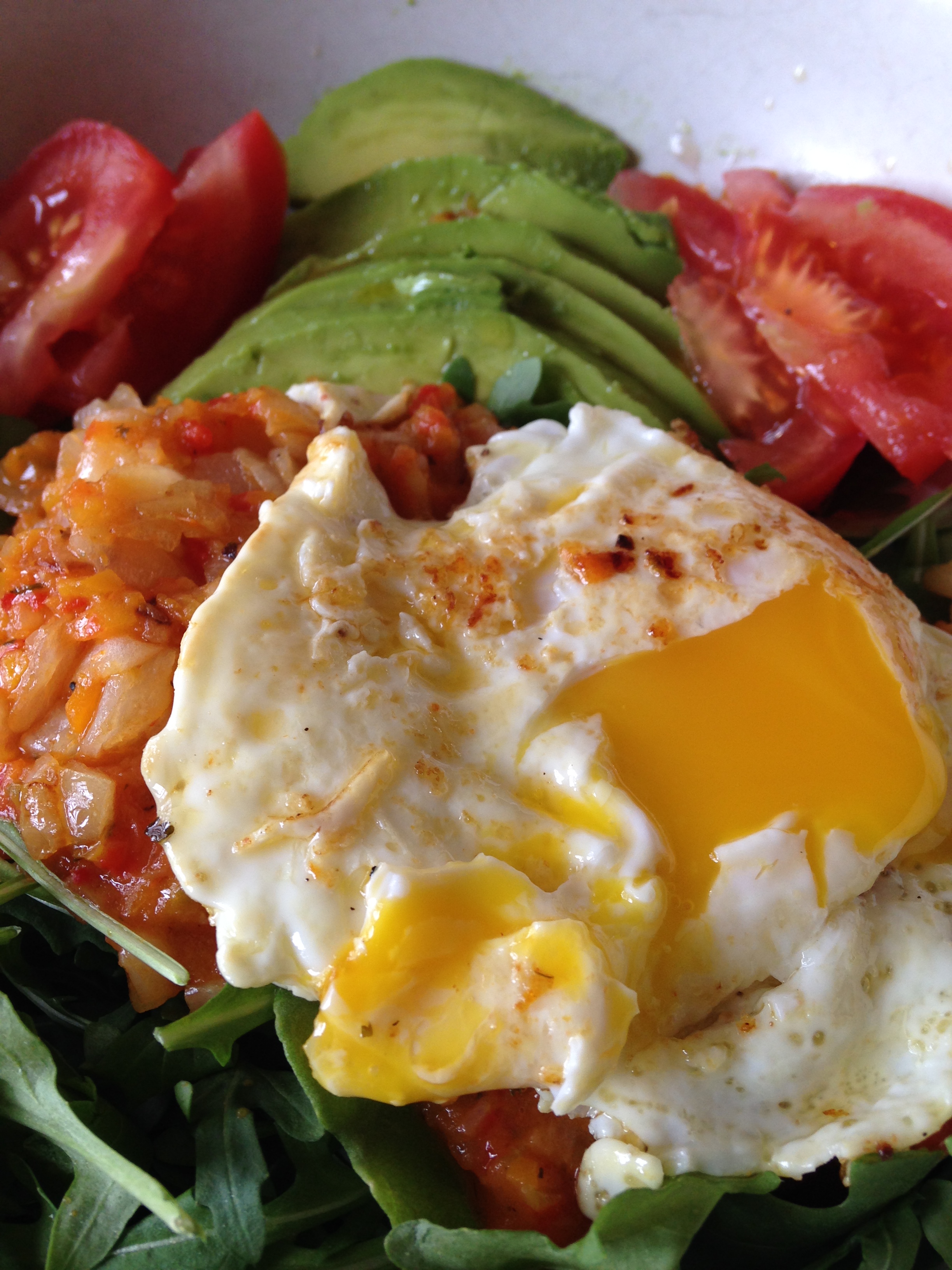 This incredible palette is made up of an organic egg, tomatoes, avocado, sauteed onions and my special sofrito, over a bed of arugula,drizzled with a hint of olive oil!
