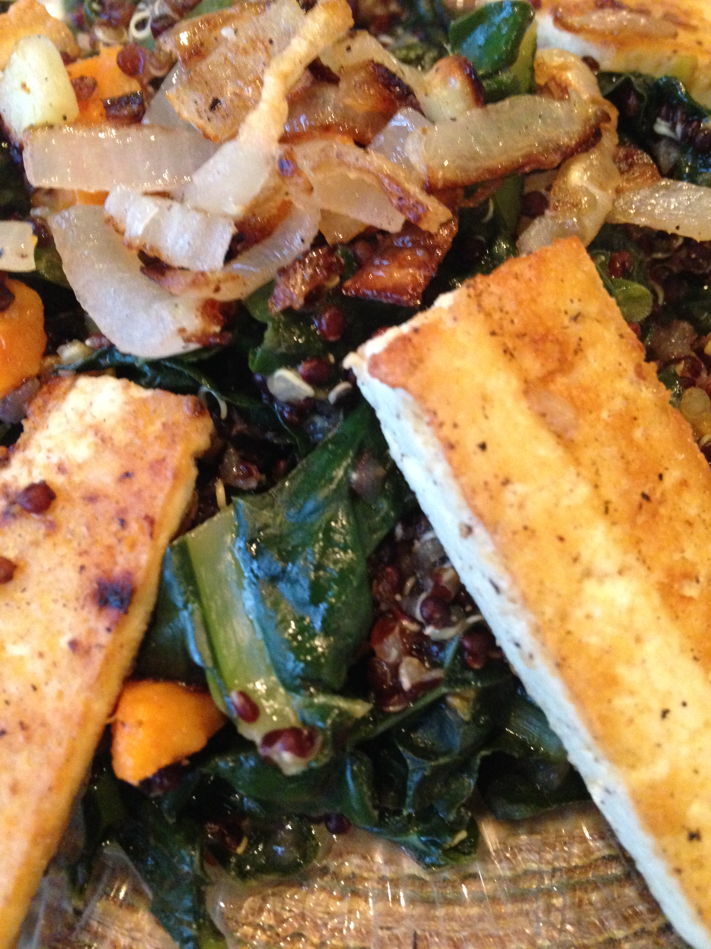 I must be craving soy today! Dinner was fantastic! A blend of sweet potato, quinoa, and kale, cooked in a ginger and miso broth, with grilled organic tofu and caramelized shallots.