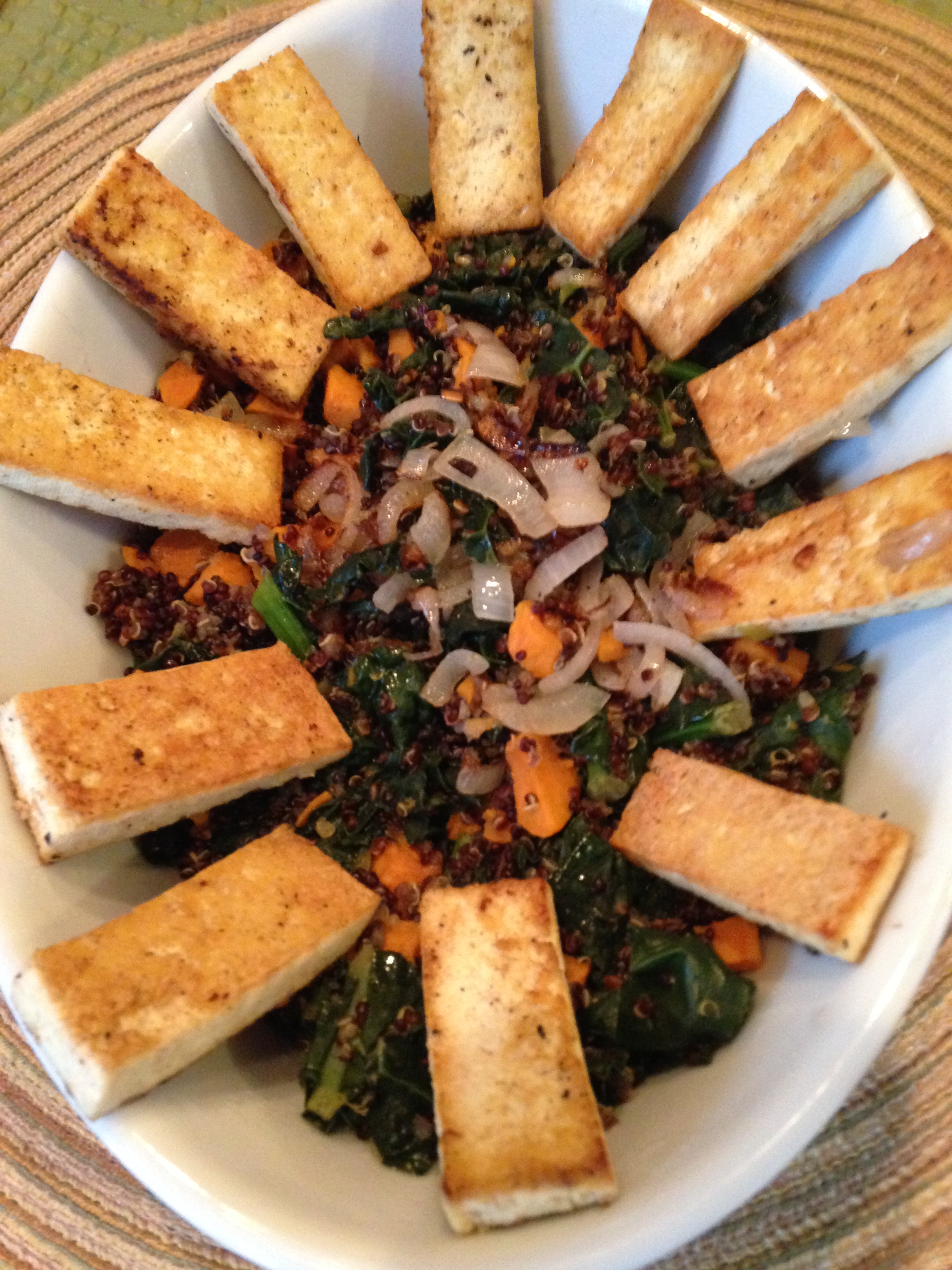 Take the tofu out of container, drain, and place on a paper towel. Bring miso & ginger broth to a boil. Add cubed sweet potato, let cook 5 minutes. Add quinoa, cover and simmer for 10 minutes. Add kale, simmer until leaves are tender. Add more broth as needed. While mixture is cooking, heat a cast iron griddle. Coat with coconut oil. Slice tofu and season with the miso & ginger broth, ginger, and garlic. Place on griddle and brown on both sides. Slice shallot thinly and cook on griddle until caramelized. Place quinoa blend in beautiful bowl, arrange tofu around the sides and place shallots in the center. Enjoy!
