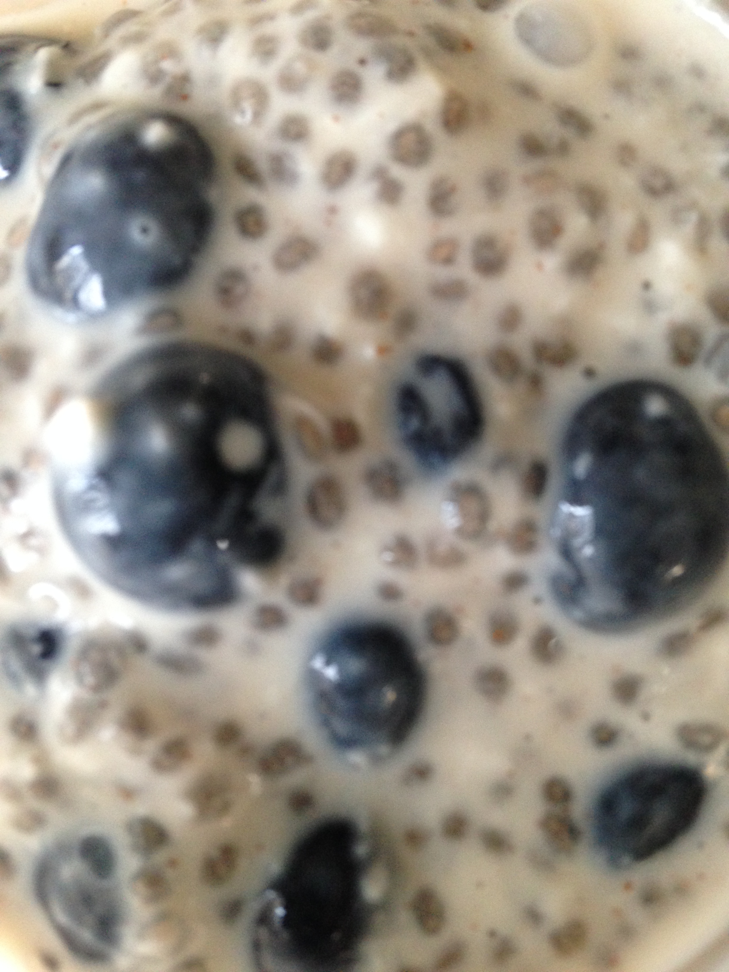 Take a jar, I like to use old jam jars, add chia seeds, a handful of blueberries, a pinch of coconut flakes, fill jar with almond milk. Add a splash of vanilla, a sprinkle of cinnamon, and a couple drops of stevia (optional and to your taste). Put the lid on and shake, shake, shake! Let sit in the refrigerator overnight. Give a quick shake in the morning before opening the lid. Enjoy!
