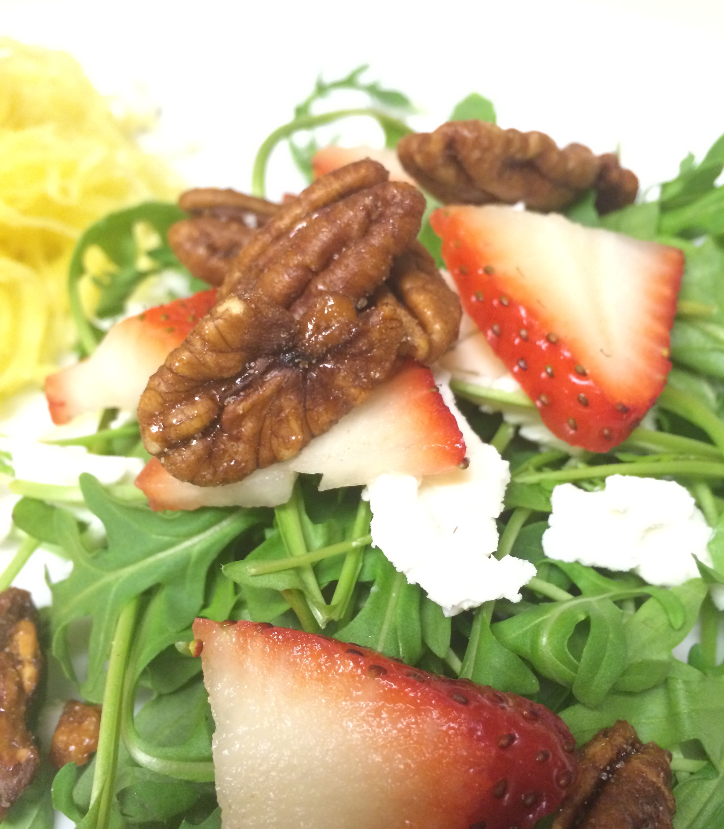 - Mom, you won’t like this because it’s got candied walnuts and mostly sweet tastes, but you could sub out any other kind of nut here, and that would work just as well.