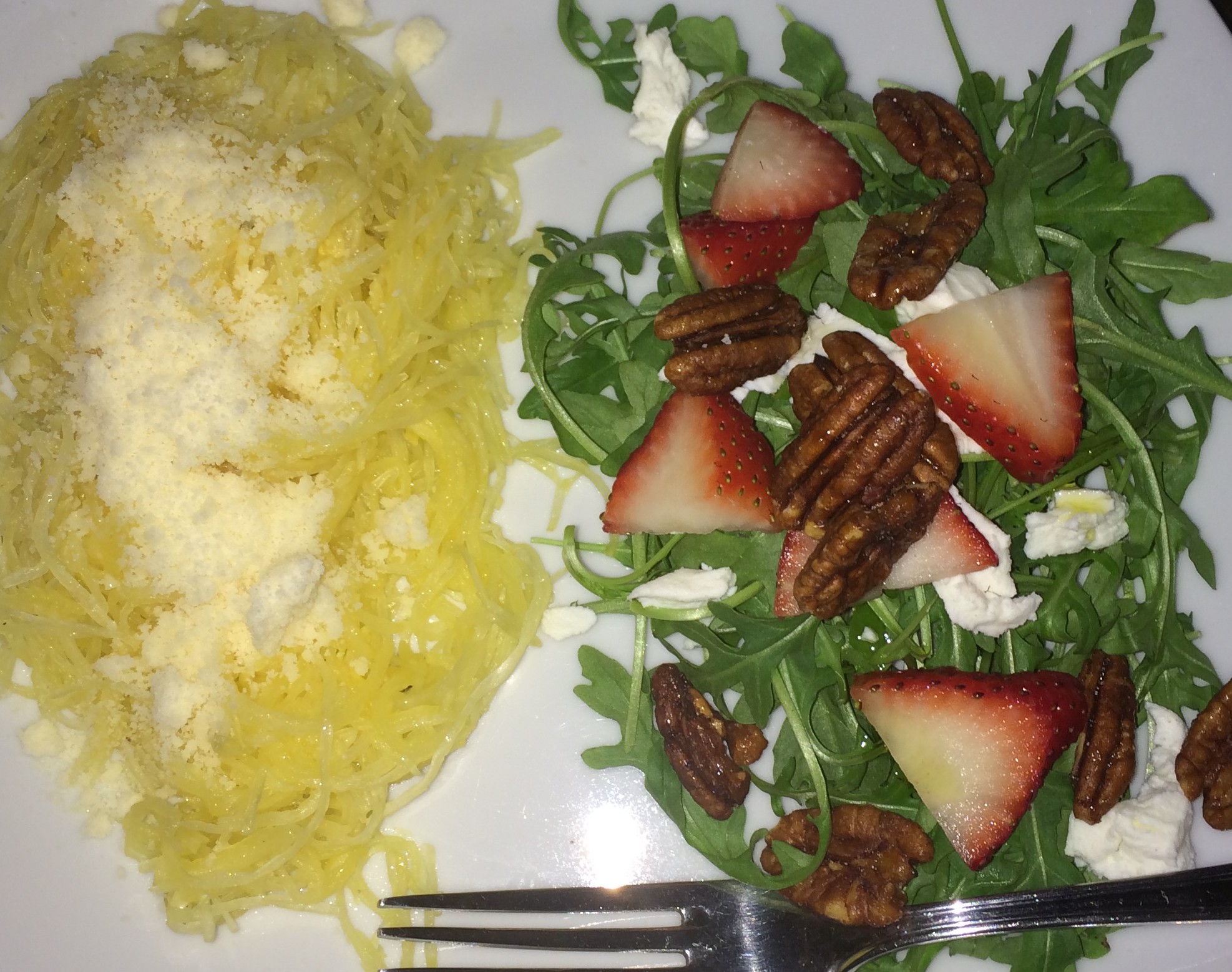 But! Just before it started I made probably one of my favorite meals (I’ve recently decided. Aside from smashed cauliflower and steak, that’s definitely up there…) – spaghetti squash spaghetti and arugula salad!