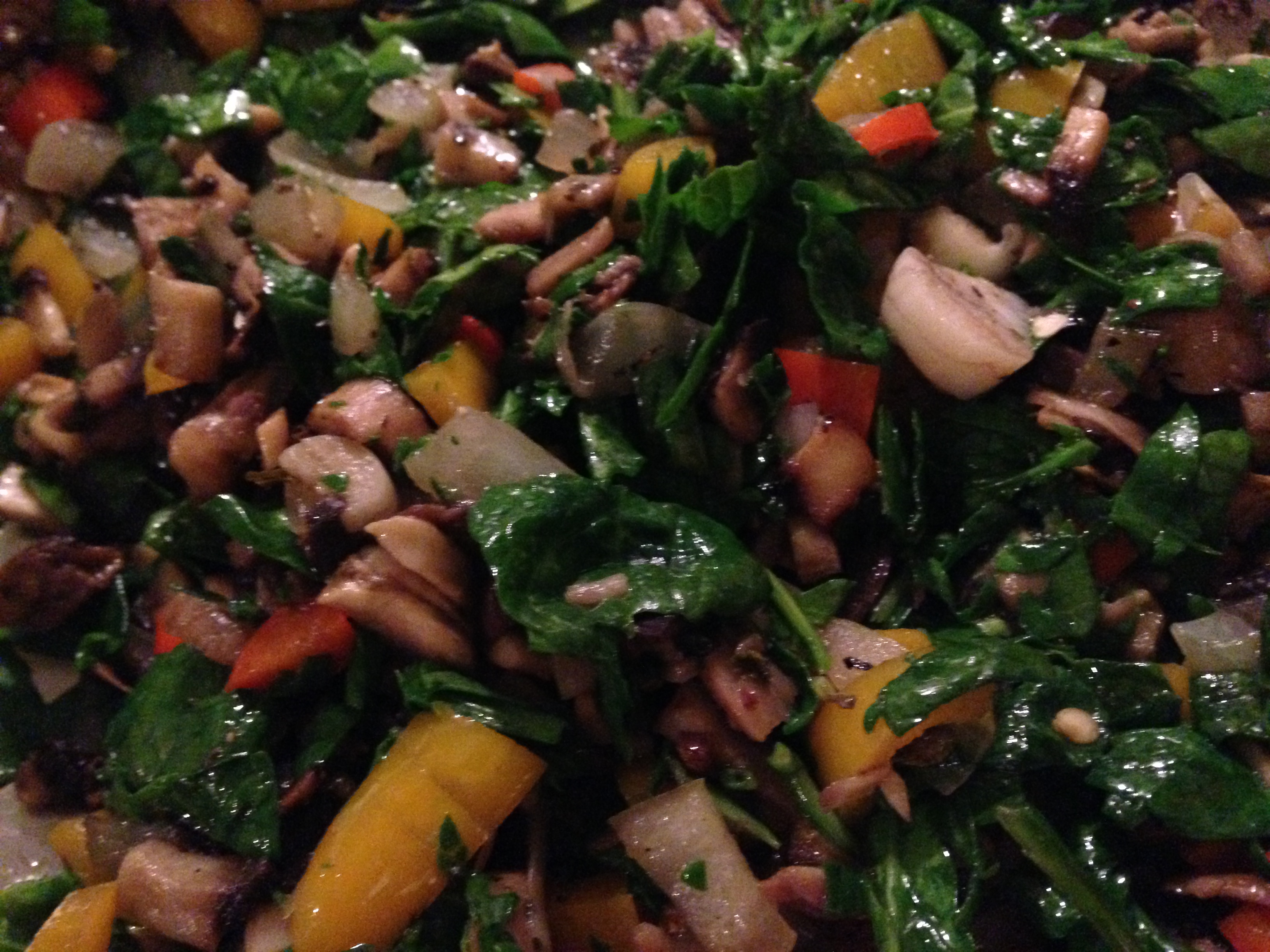 Heat skillet, add about a tablespoon of olive oil. Add onions and peppers, saute for a few minutes. Add mushrooms and garlic. Saute a few more minutes. Add lemon juice. Add white wine. Let cook down a few minutes. Add basil, spinach, oregano, salt and pepper. Cook until spinach wilts. Add parmigiano cheese. Let cool.