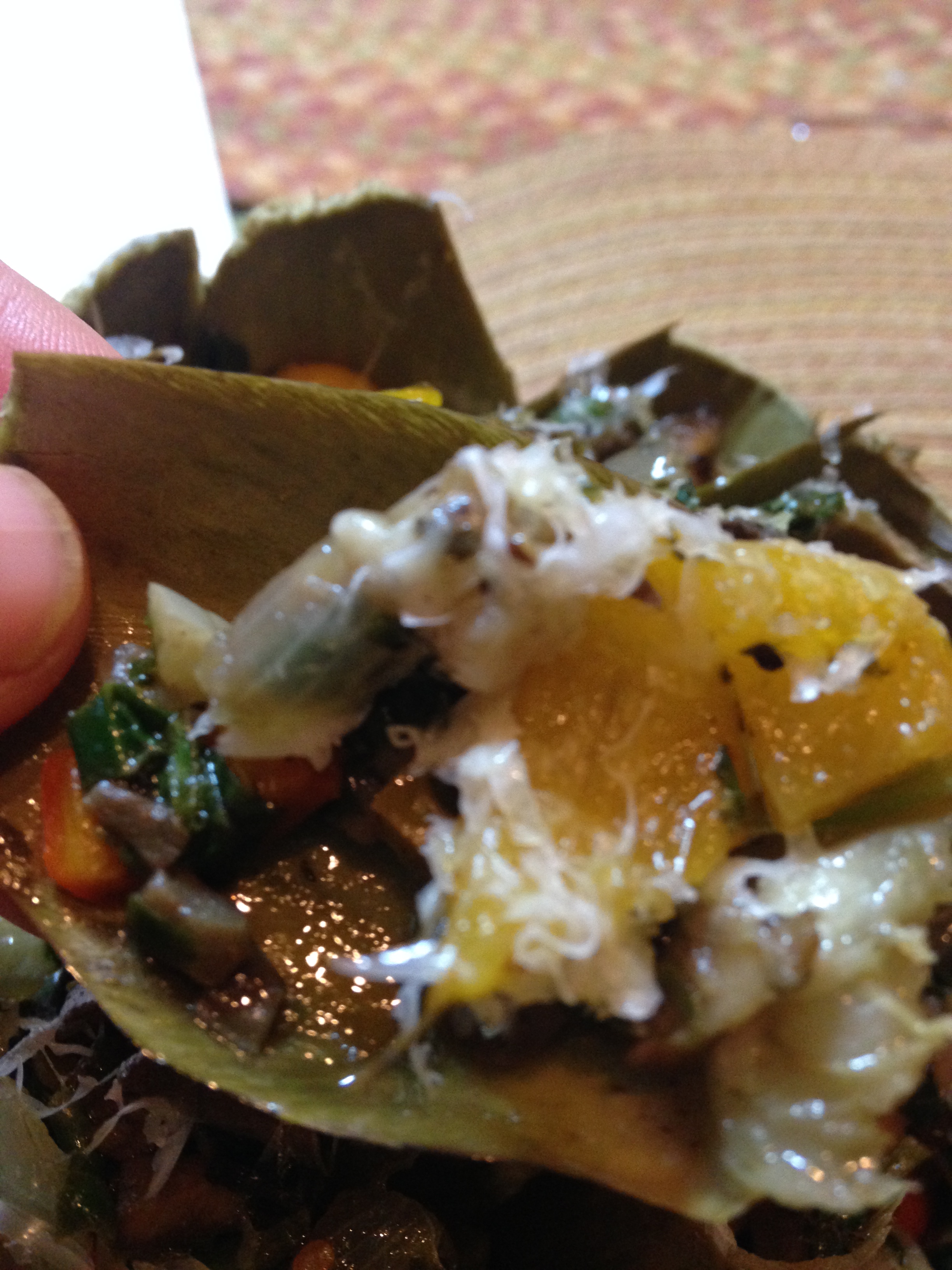 The fun part about artichokes is eating the outer leaves. It’s like playing with your food! You scrape the leaves over your bottom teeth when you eat them! They have a little bit of an earthy and nutty flavor. Delicious! After you go through the leaves, you will come to the “choke” – DO NOT EAT this part of the artichoke, just remove it and underneath is what some believe to be the most flavorful part, the heart! It doesn’t look pretty, but dipped in the olive oil left from your stuffing, it is worth all of the work! Enjoy!