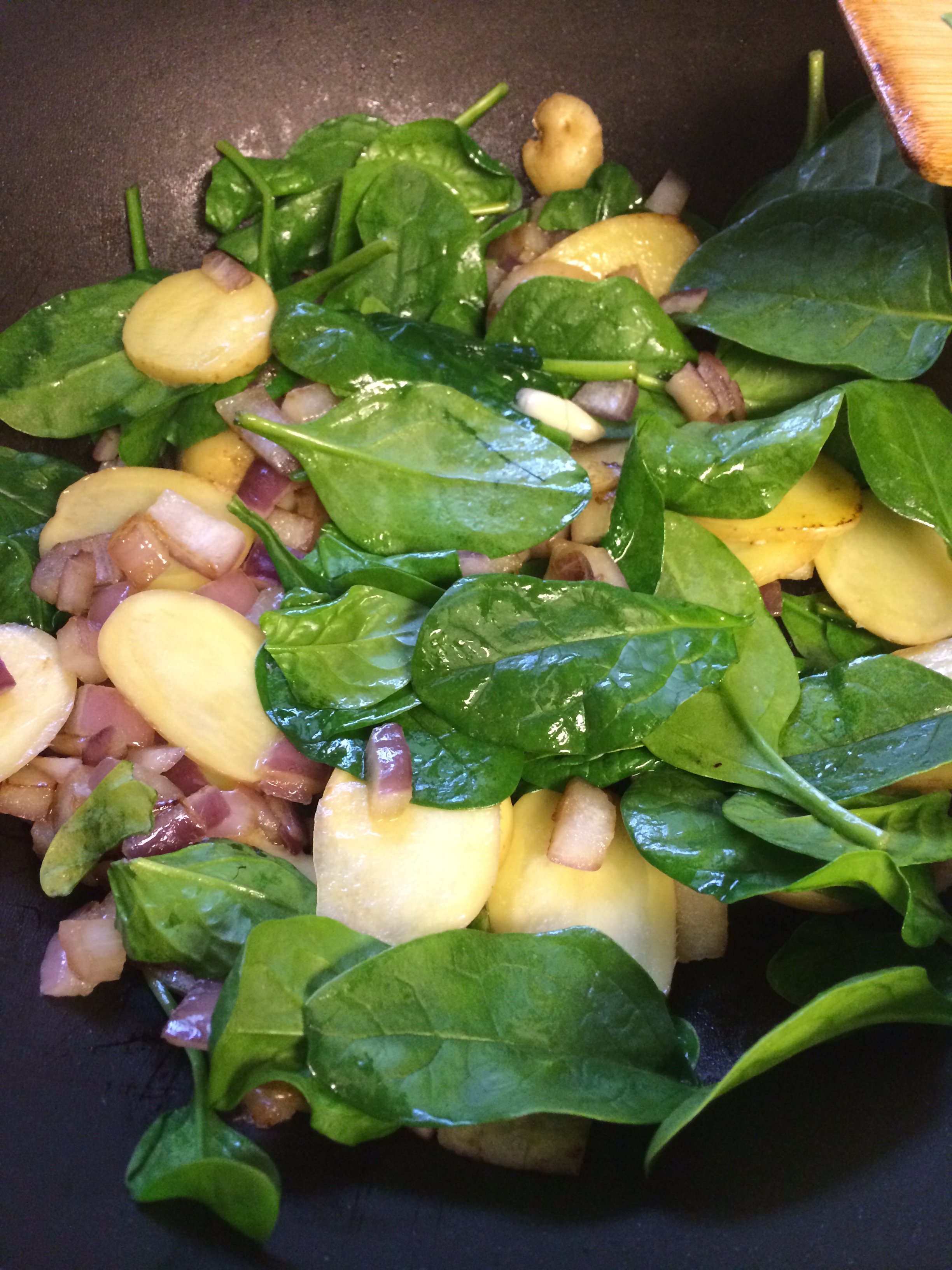 So I had 3 mini golden potatoes from my Healthy(ish) Potato Salad so I sliced those up thin, then I found some spinach, half a red onion, and I was off.