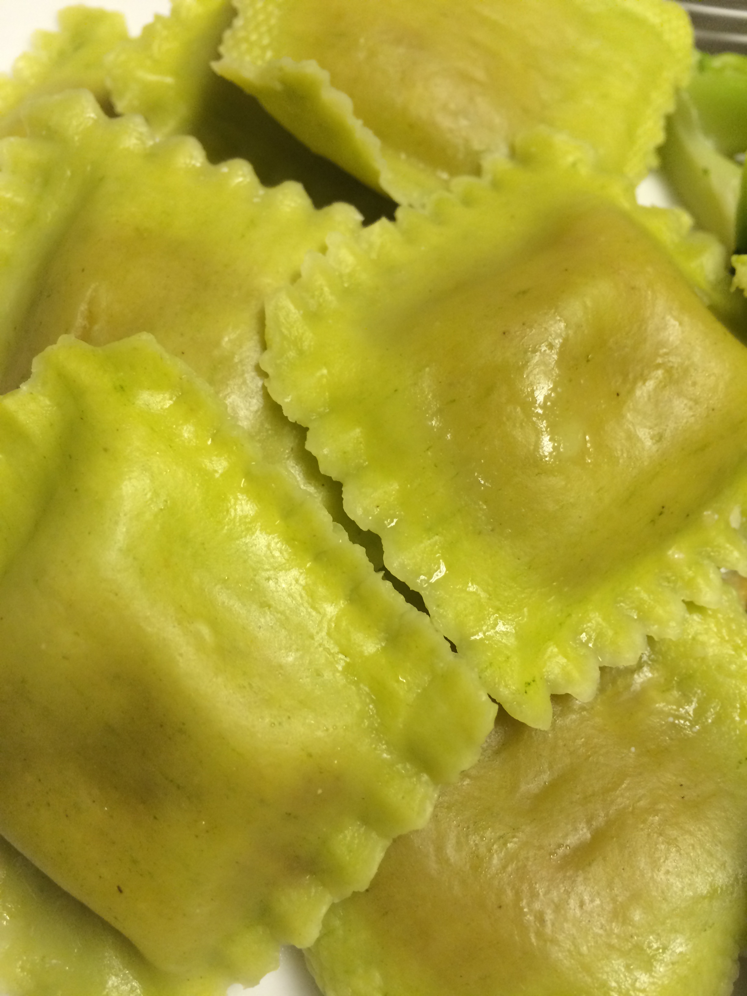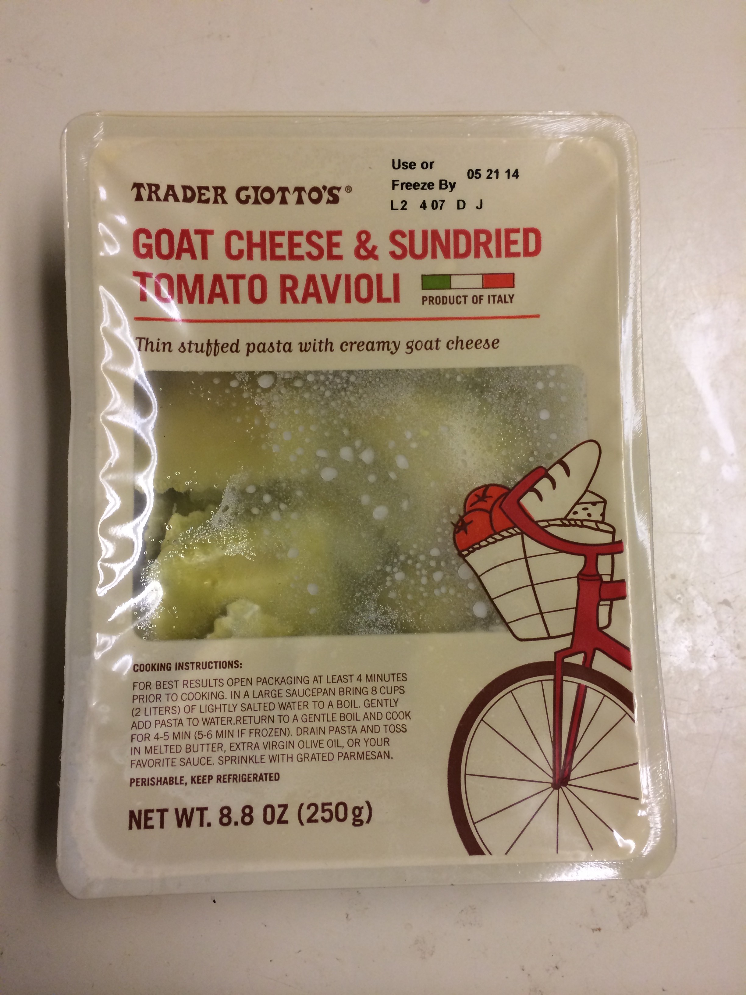So Monday night I needed something quick because I had a TON of work to do. So out of the freezer came some Trader Giotto’s (Trader Joe’s, you’re so clever becoming and Italian chef) goat cheese and sun-dried tomato ravioli! YUM. And I had some frozen broccoli so I just steamed some of that and voila! A delicious meal.