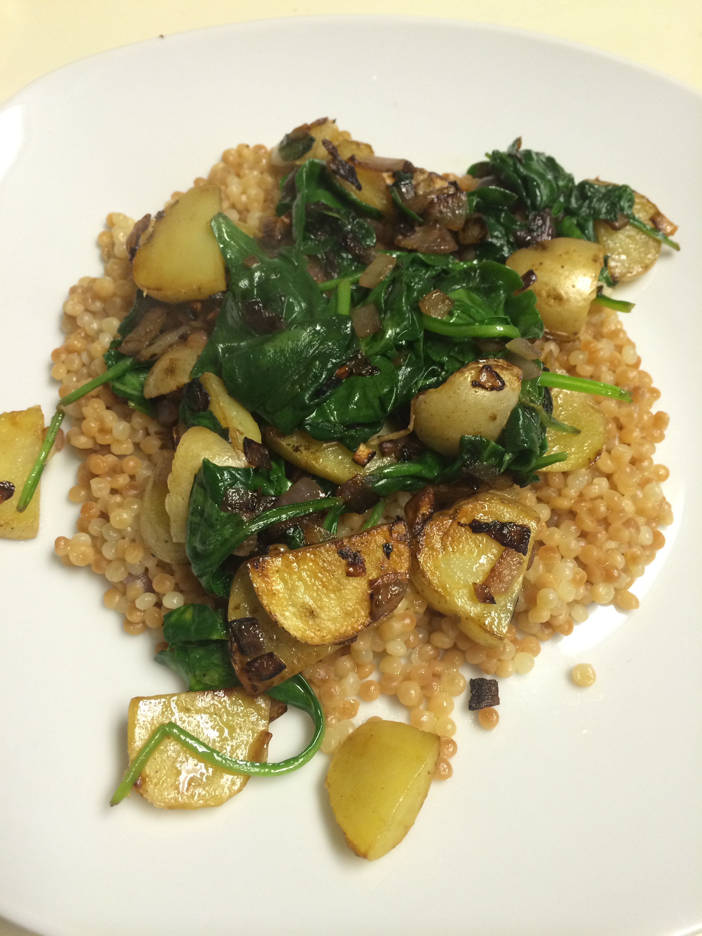 - Finally, once the potatoes and onions have had time to cook, add the spinach and cook down!