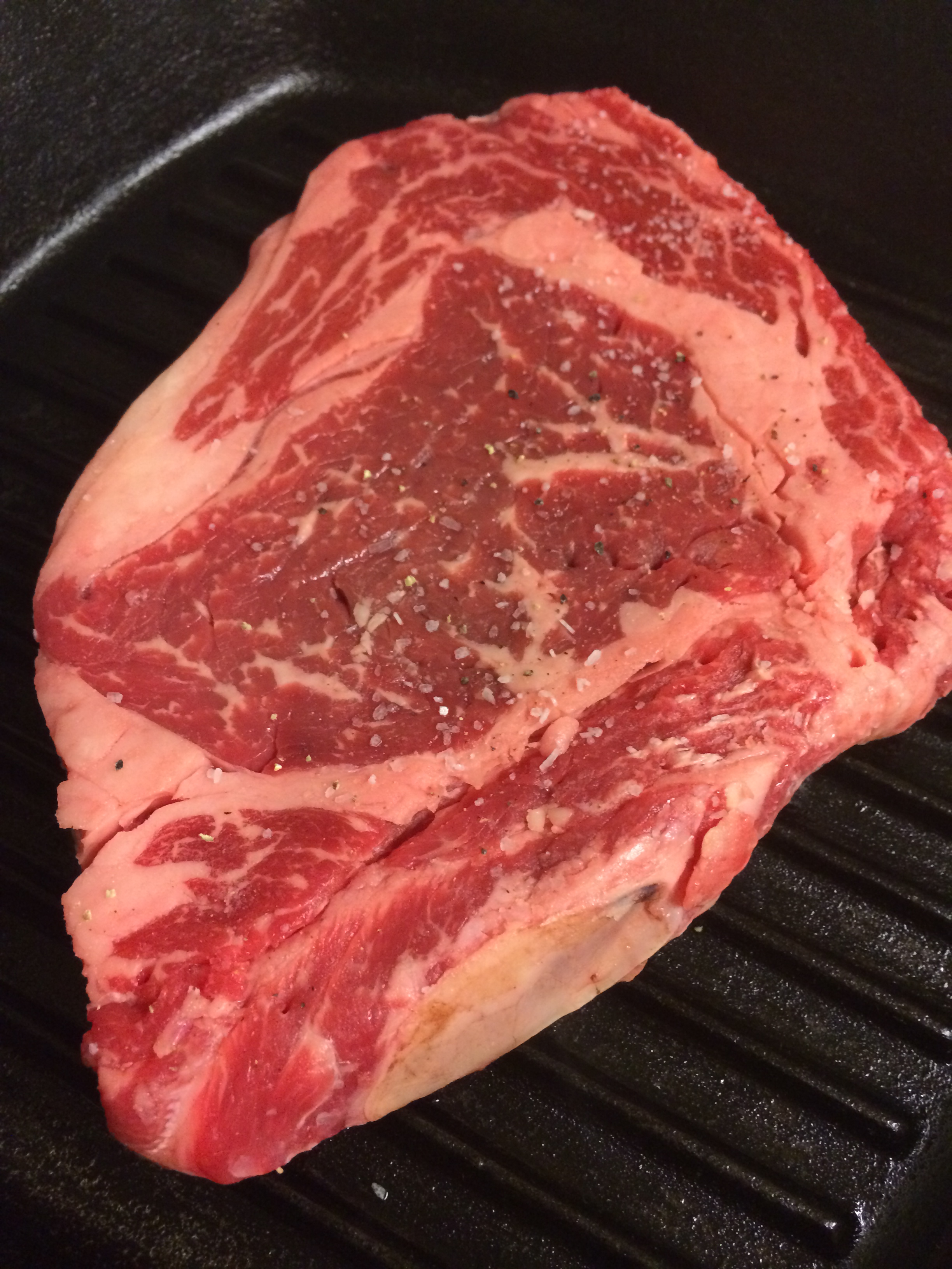 Rib-eye steak, hell yeah! Rib-eye steak tends to always be a reasonable price when I’m in Trader Joe’s… it’s like they know I’m coming! What I haven’t mastered about the art of cooking steak just right (I like it rare, but I always tend to leave it either a little over-done or a little too bloody, even for me). I even know the whole check how done your meat is by touching your thumb and (depending on how well done you like it) index finger, poke the heel of your palm, and if the meat feels the same, ya done! But, alas! I think you just need to spend enough time trying it to get it right.