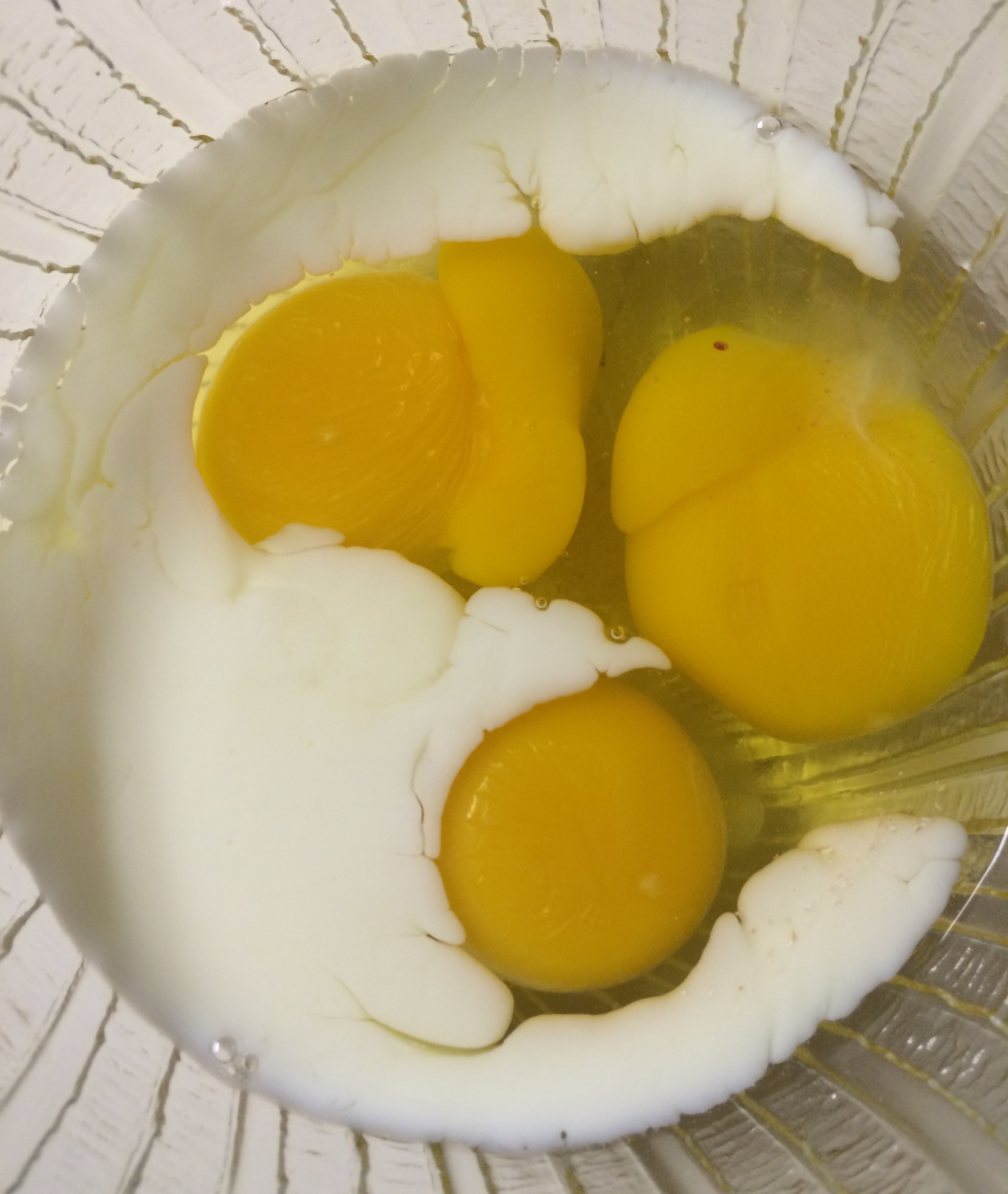 Sometimes you get twin yolks!!! But basically, two eggs, 1/3 cup of milk, salt and pepper. Stir it up with a fork and you’re ready!
