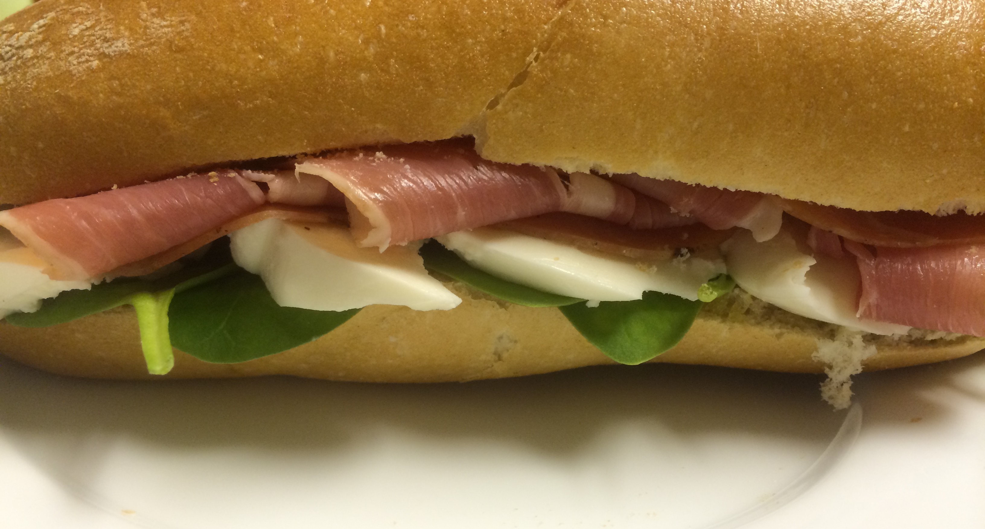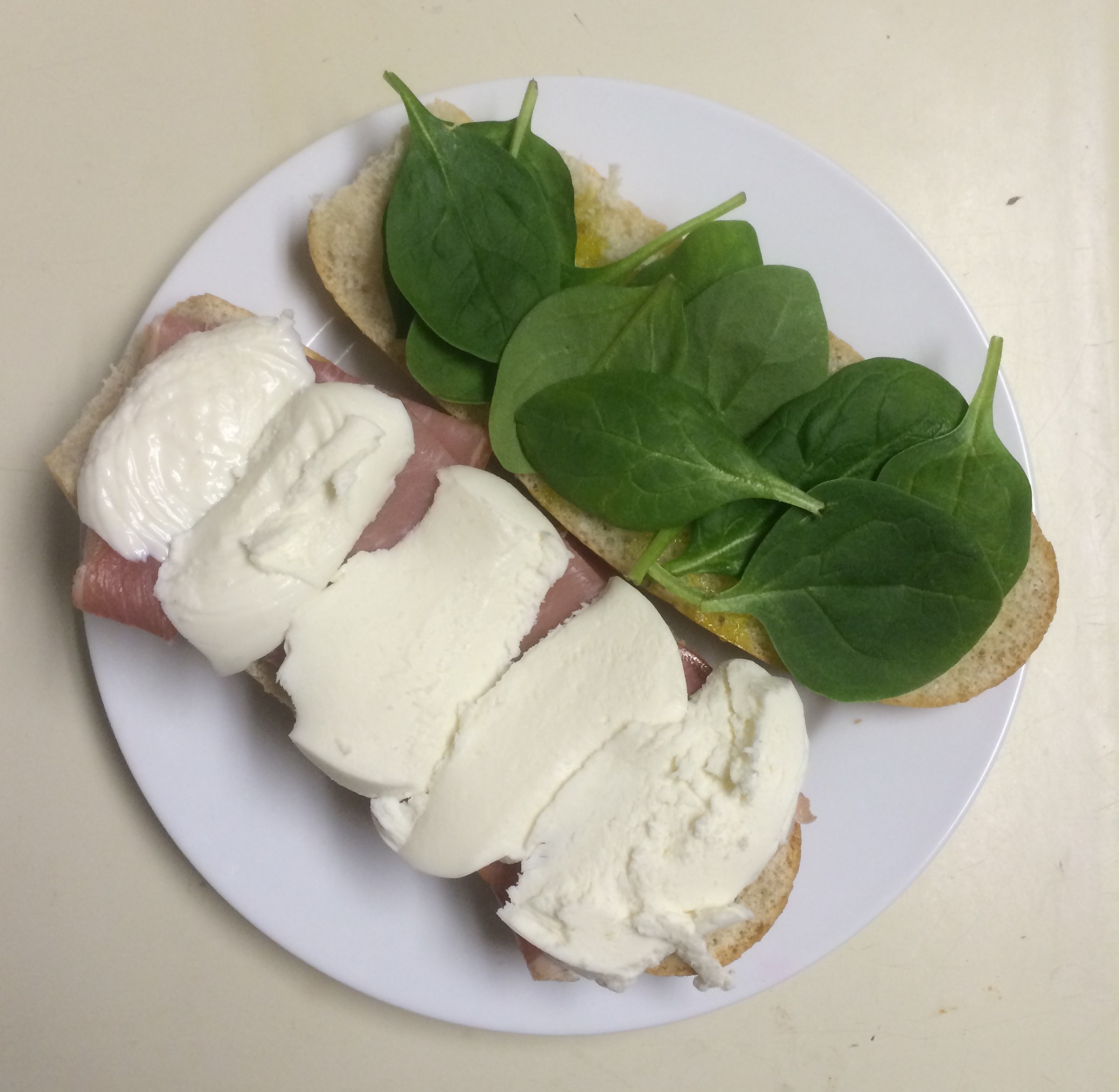 I bought a french roll, and some mozzarella, and a small package of prosciutto, some EVOO, and a some baby spinach.