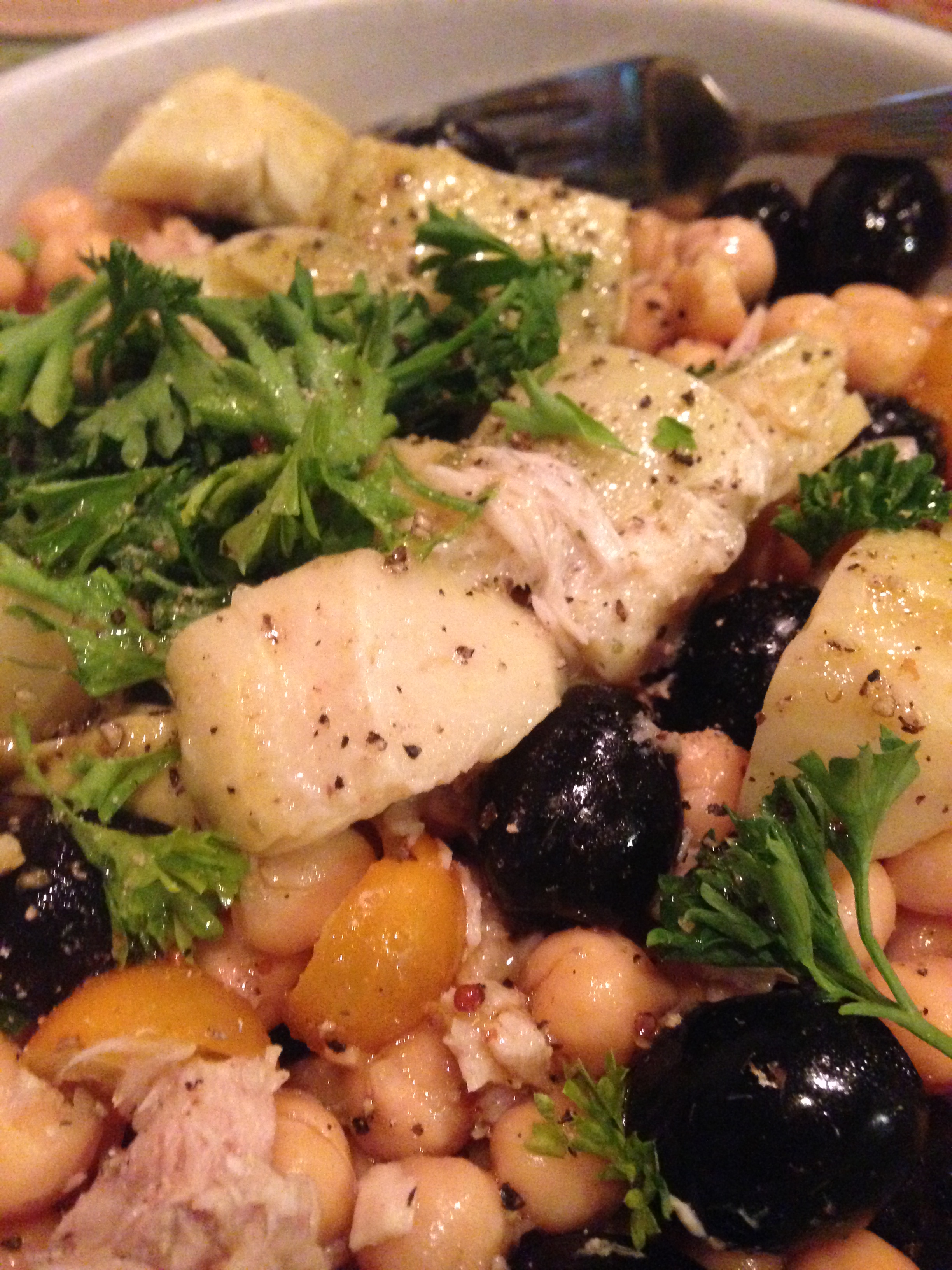 On a stormy Friday night, I decided to go light with a delicious tuna salad – Linda style! So simple – albacore tuna, with black olives, sweet yellow tomatoes, chick peas, marinated artichoke hearts, white onion, salt, pepper, fresh parsley and a drizzle of my famous home made dressing. This is such a perfect Friday night meal when you do not have the energy to cook, want something light but satisfying and something with a ton of flavor! Enjoy!