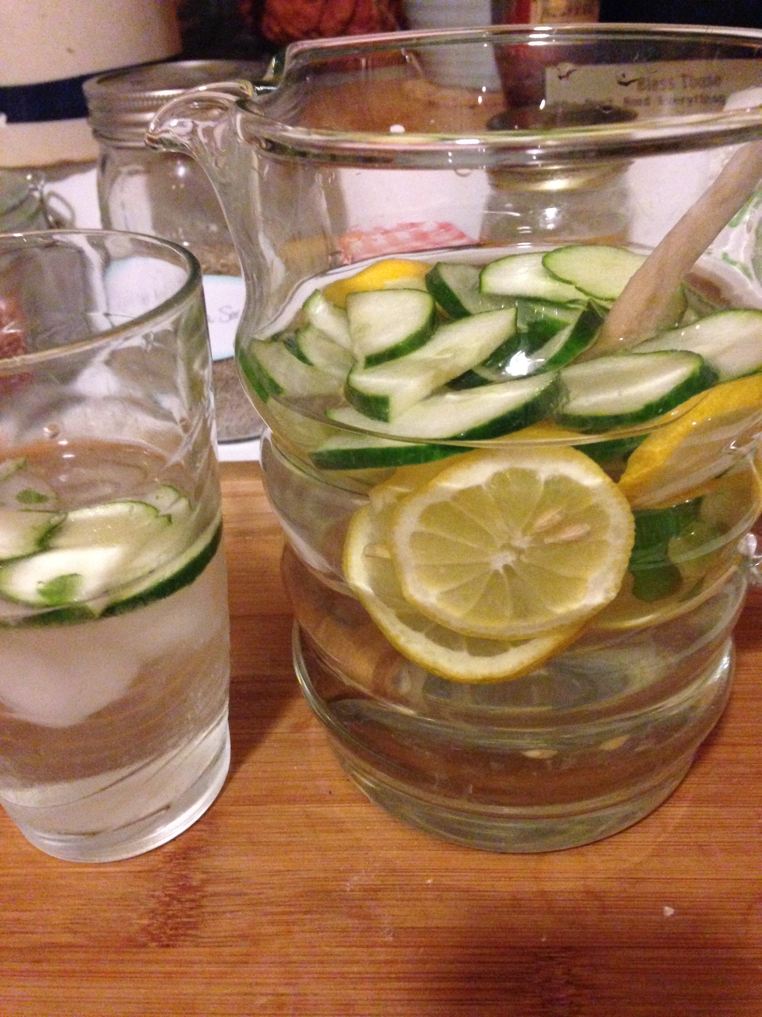 Inspired by one of my colleagues, I made a delightfully refreshing drink on this humid evening! It’s also an opportunity to use my new glass pitcher (sadly, because I broke my favorite glass pitcher last week). Thinly slice a third of an organic cucumber, thinly slice an organic lemon and put into a medium sized pitcher. Add filtered water and a sprig of mint; I have it growing in the garden. Stir and pour over ice! I can’t even describe how fresh tasting this clean drink tastes!