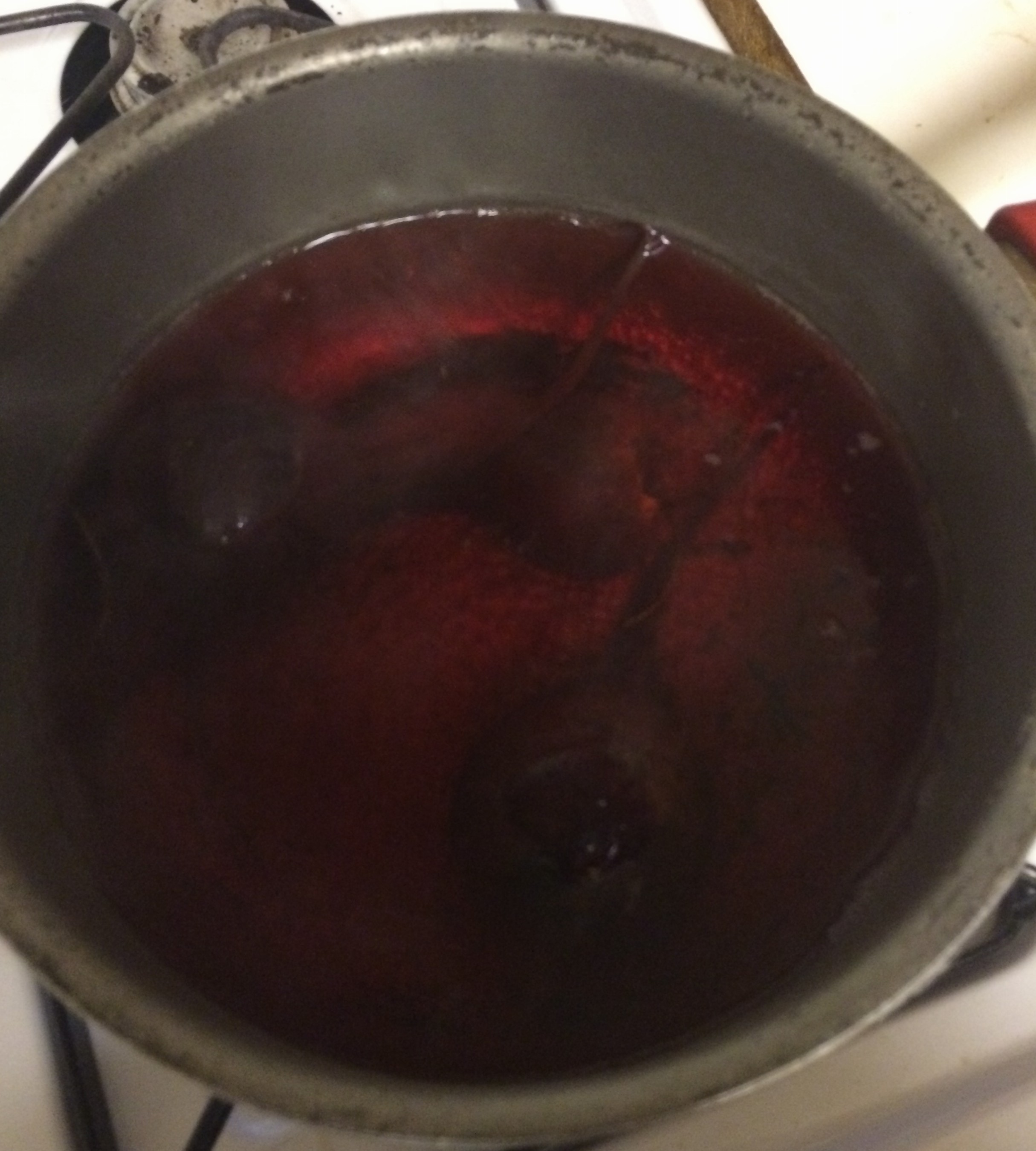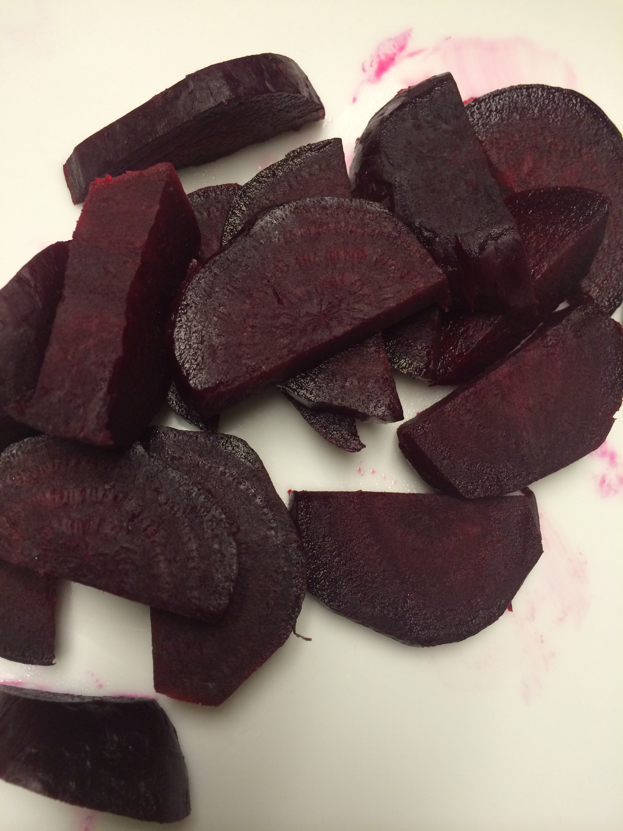 Look how weird! I boiled the beets for ~30 min until I could poke them with a fork. Then I peeled off the skin – which was simultaneously easy and not at all – and cut them up, sprinkled a little salt, and voila! They were like candy!!