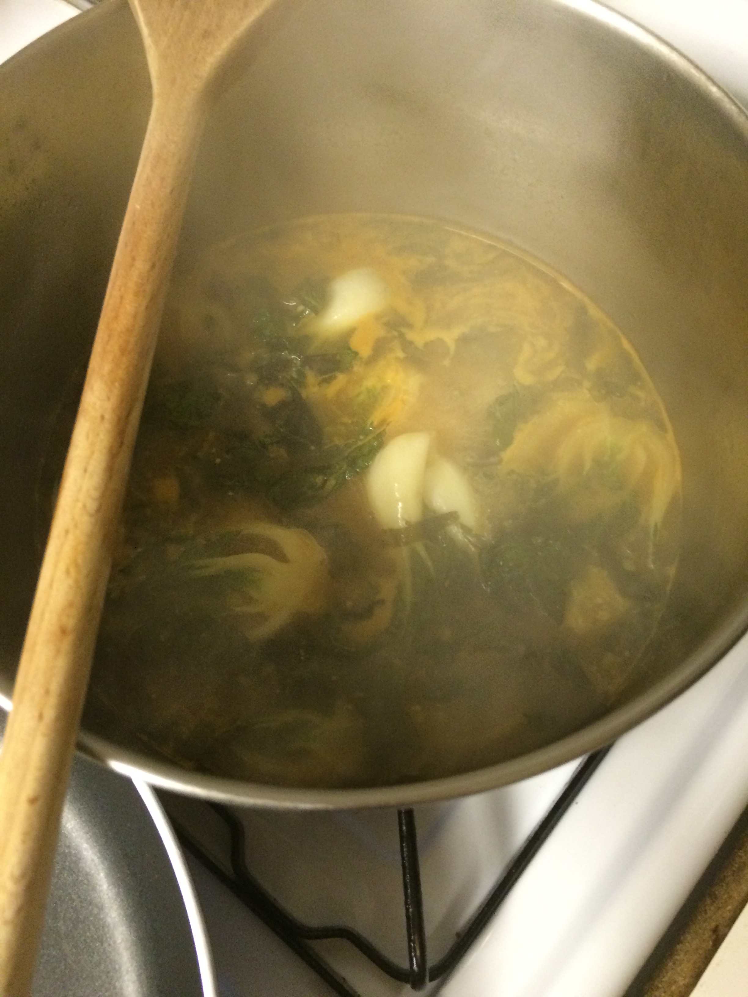 So before doing anything else, heat some salty water to boiling. Then, in a separate bowl mix together miso paste, takami, and 1/4 cup of water. In a big pot, heat 2 tbsp olive oil. Sauté tatsoi, ginger, and white parts of scallion till the tatsoi wilts a little. Add the miso mixture, 3 cups of water, dried wakame, and some sriracha. Now, ma, you know I don’t like spicy so I didn’t put much sriracha but just enough made it taste pretty swell.
