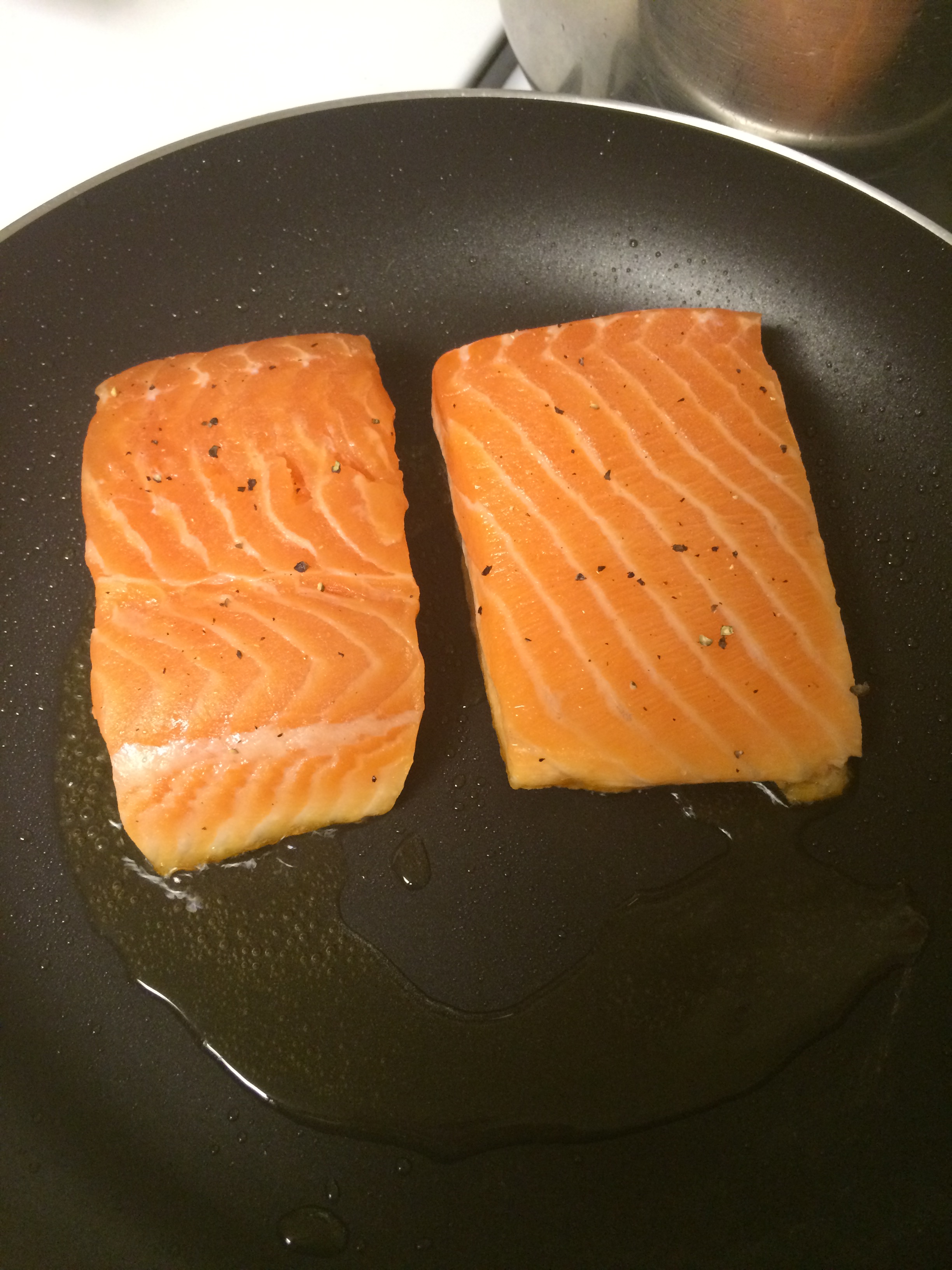 First, pat dry and season with salt and pepper. Then, heat some olive oil and sear the salmon by cooking on each side for a few minutes. Sear? Is that the right expression?