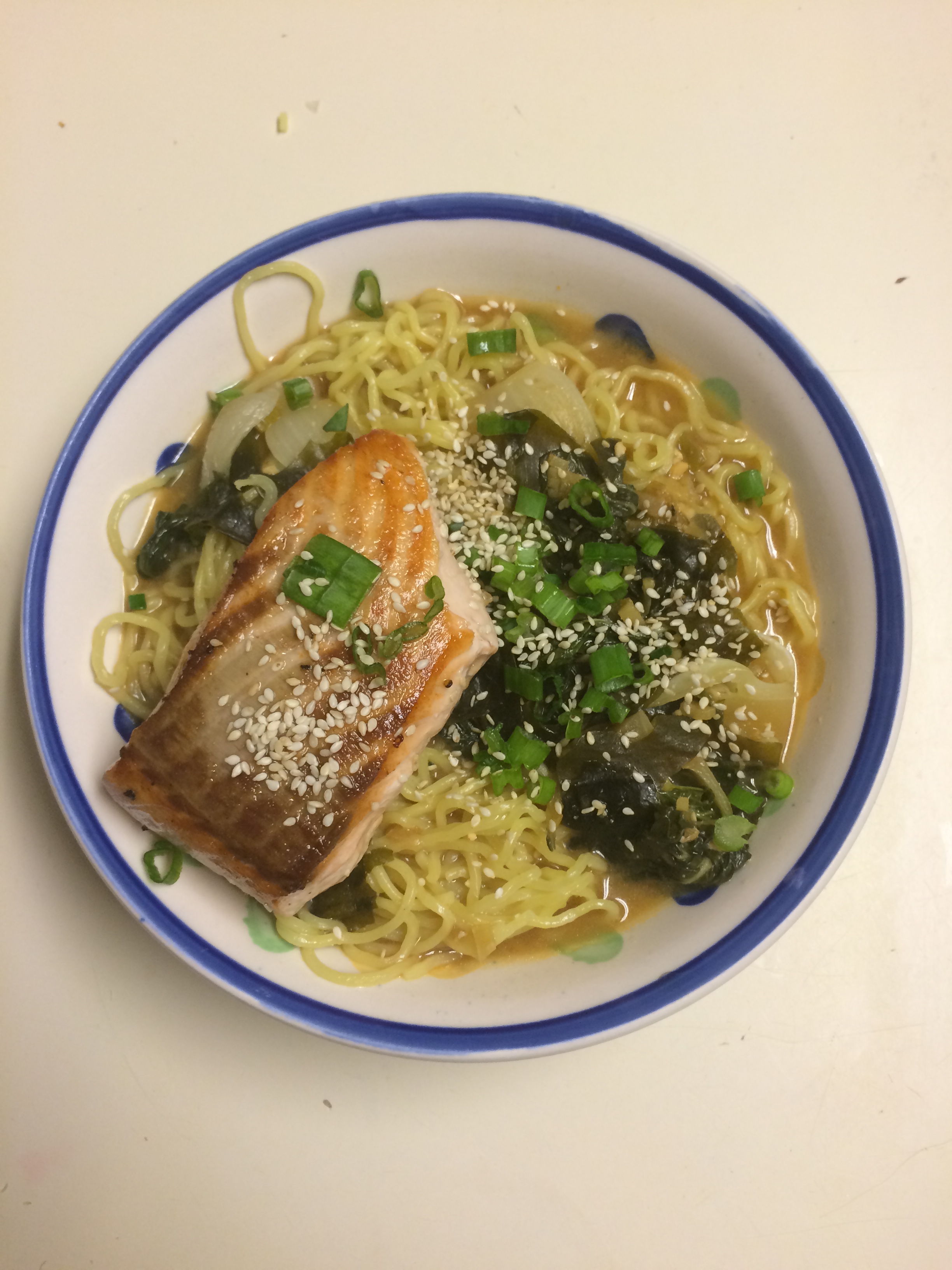 While the salmon cooks, put some ramen in a bowl, pour the soup over the ramen, then top with the salmon when it’s done. Garnish everything with the green scallion slices and sesame seeds.