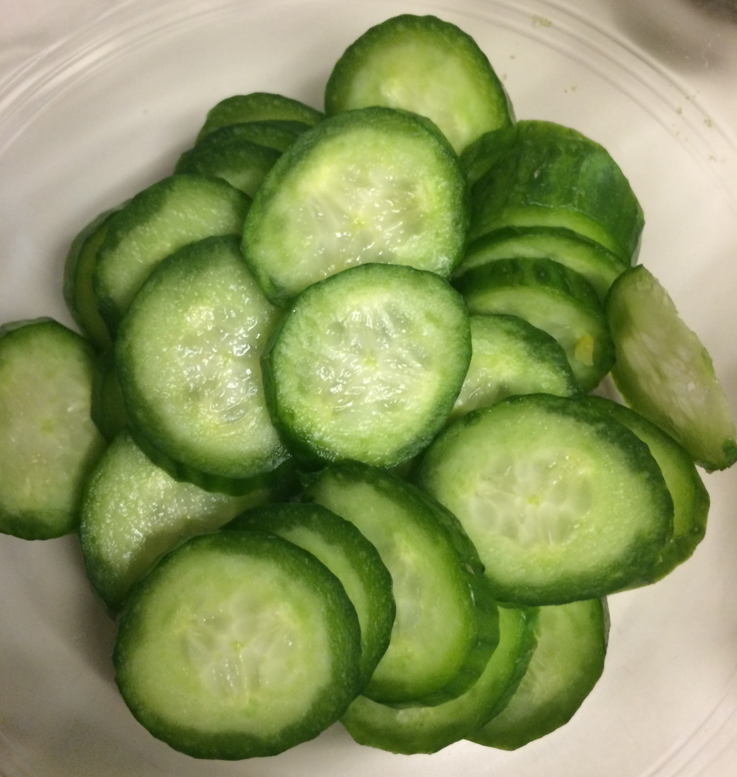 Parisian cucumbers (those are the tiny ones), sliced on an angle