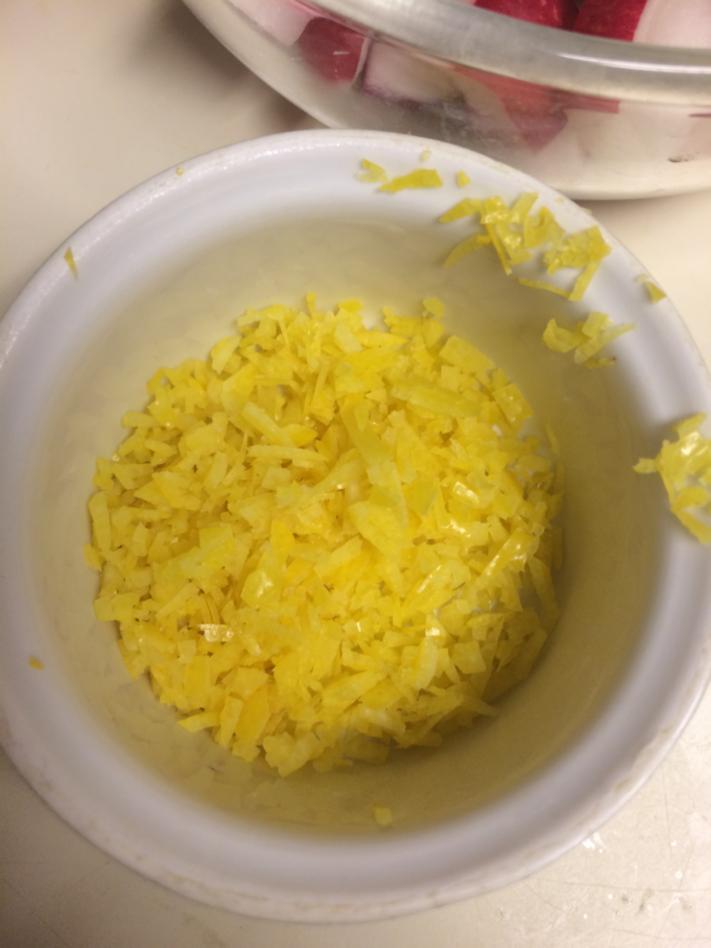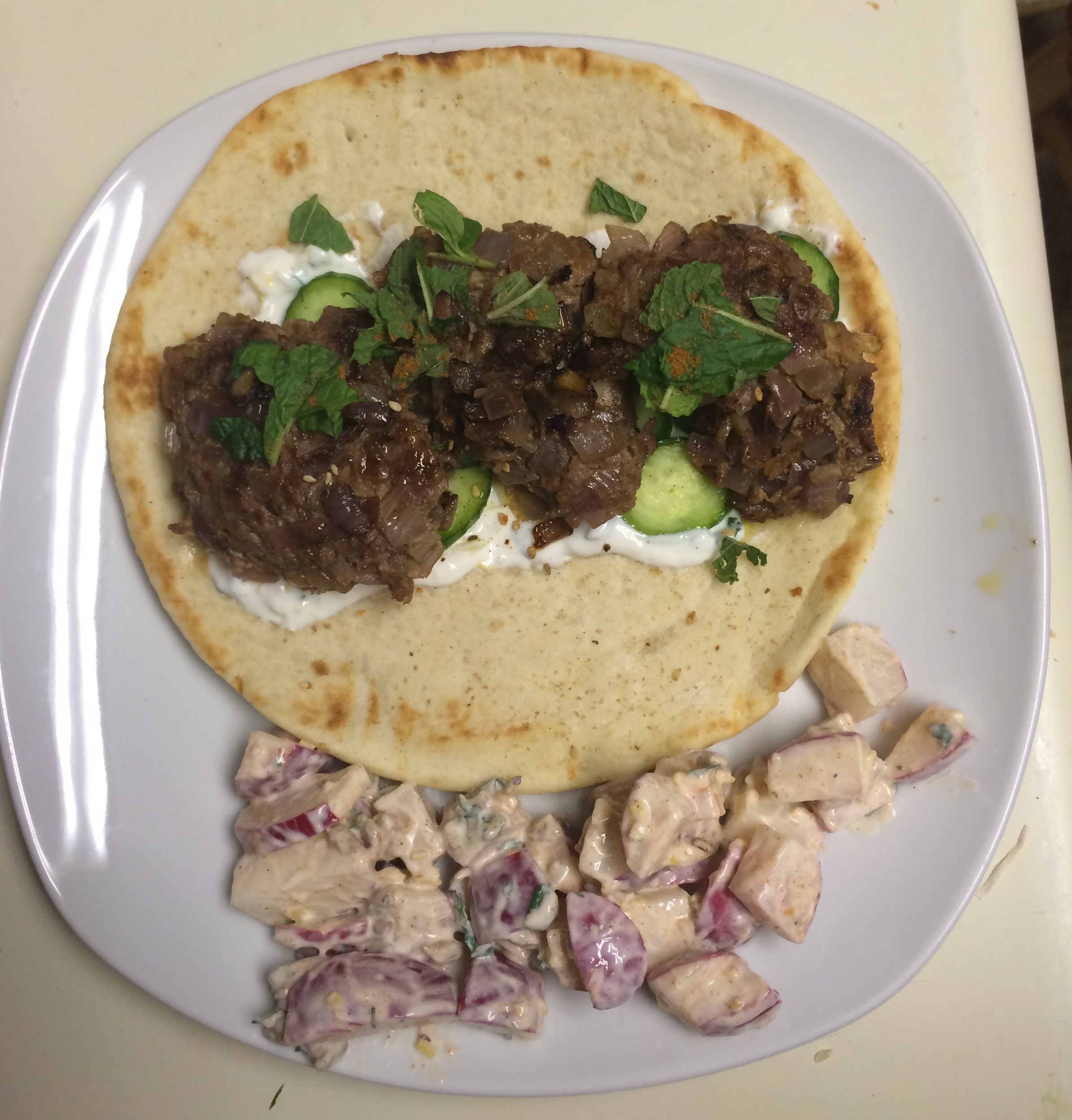 So start with some plain greek yogurt and add to it lemon zest, juice from lemon quarters, chopped mint, and some spice blend. Remember to chop the mint now, for maximum flavor! And save some mint to garnish for later. This is going to be used on the schawarmas themselves and also in the radish salad. (Can you tell I have no idea what part of this is actually “shawarma”? I just looked it up, it’s got to do with how you cook the lamb.)