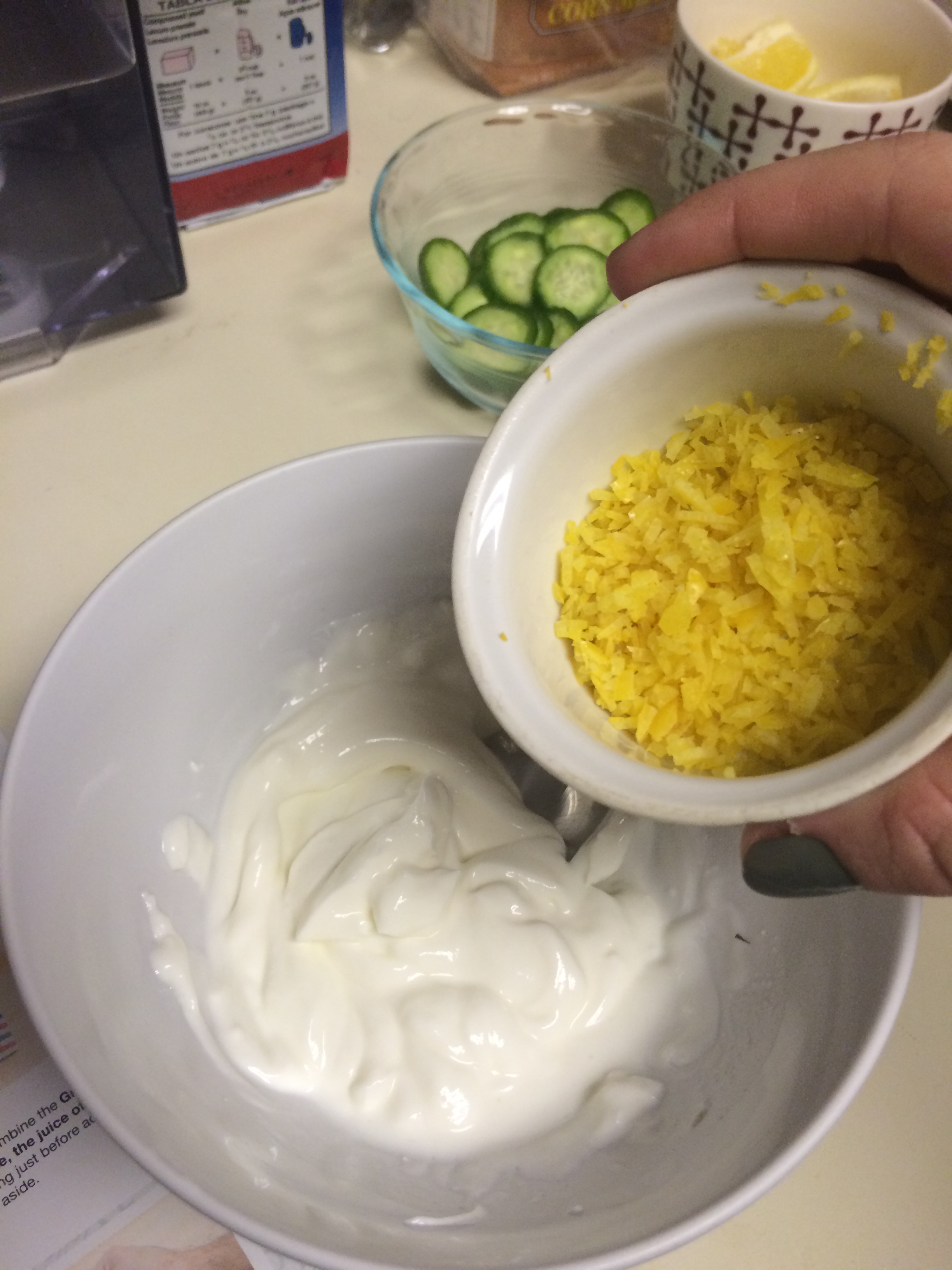 Have a glass of wine/beer and lets just review: mint, radish, lemon zest, lemon quarter, onion, garlic, cucumber!