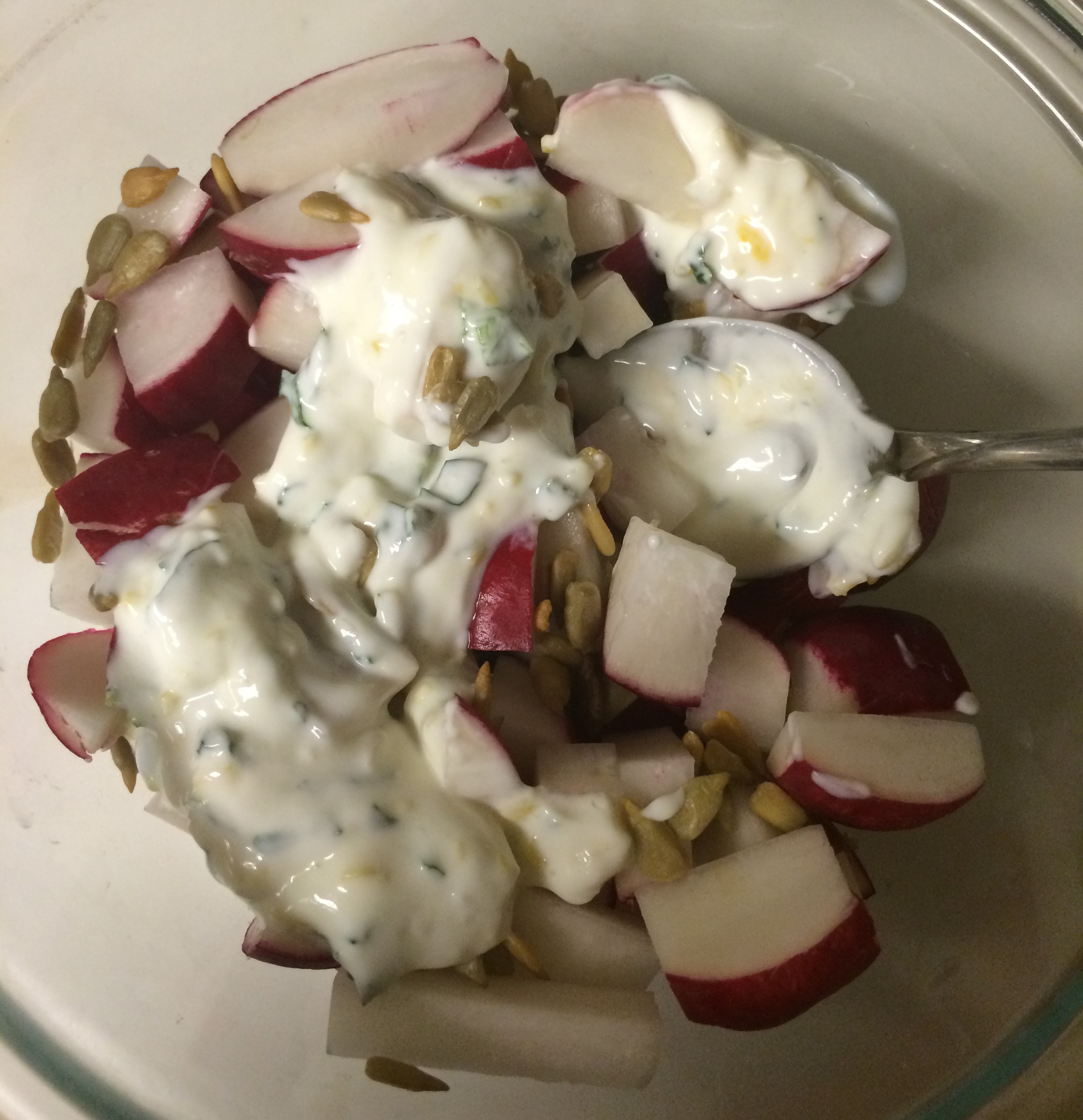 Oh! I almost forgot the radishes! Add half the sauce to the chopped radishes, plus some sunflower seeds and spice blend!