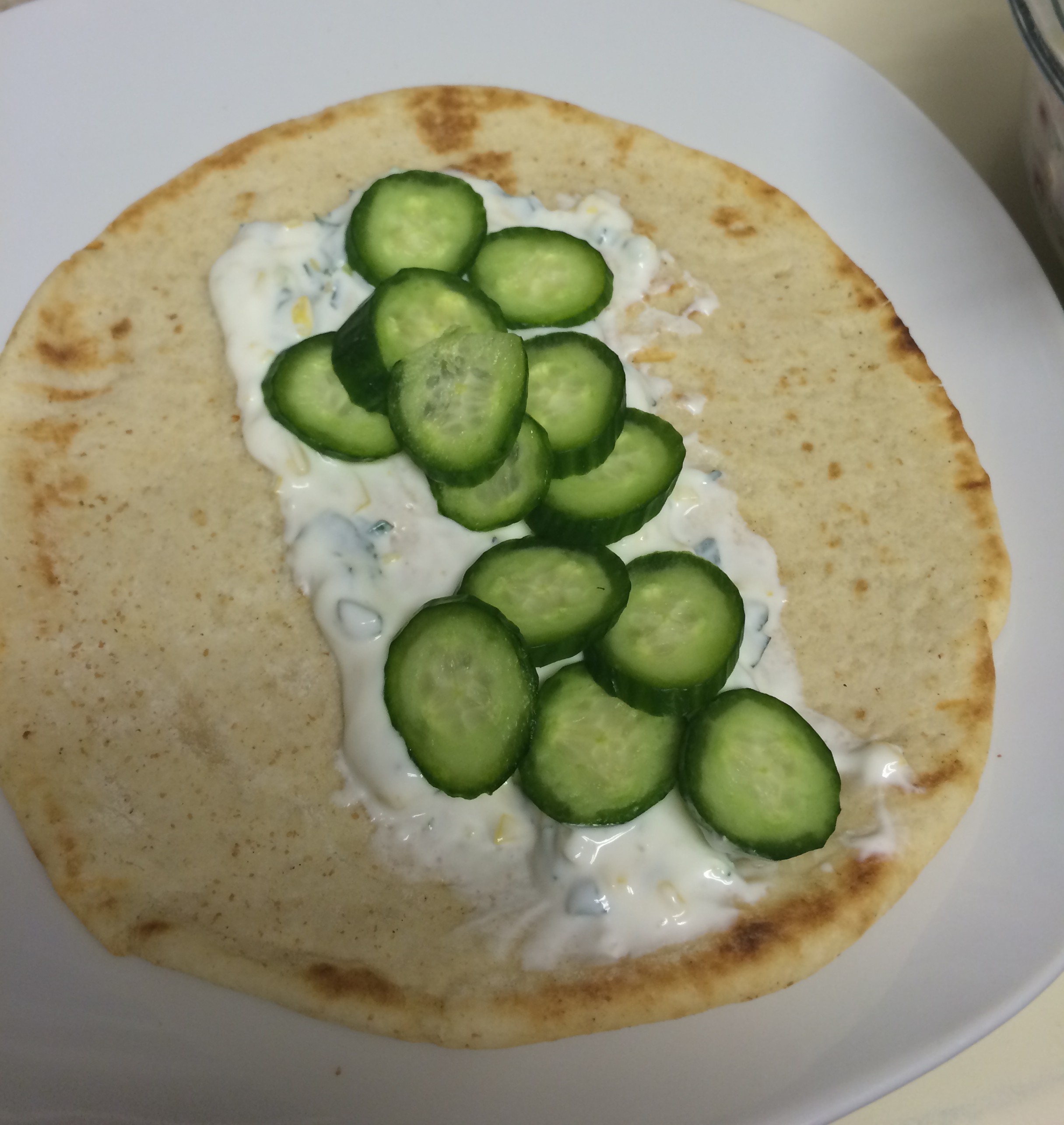 YUM! Meanwhile, heat up two pitas in the oven and put some tzatziki sauce and cucumbers down to make a luxurious, princess quality bed for those little lamb slices of heaven.