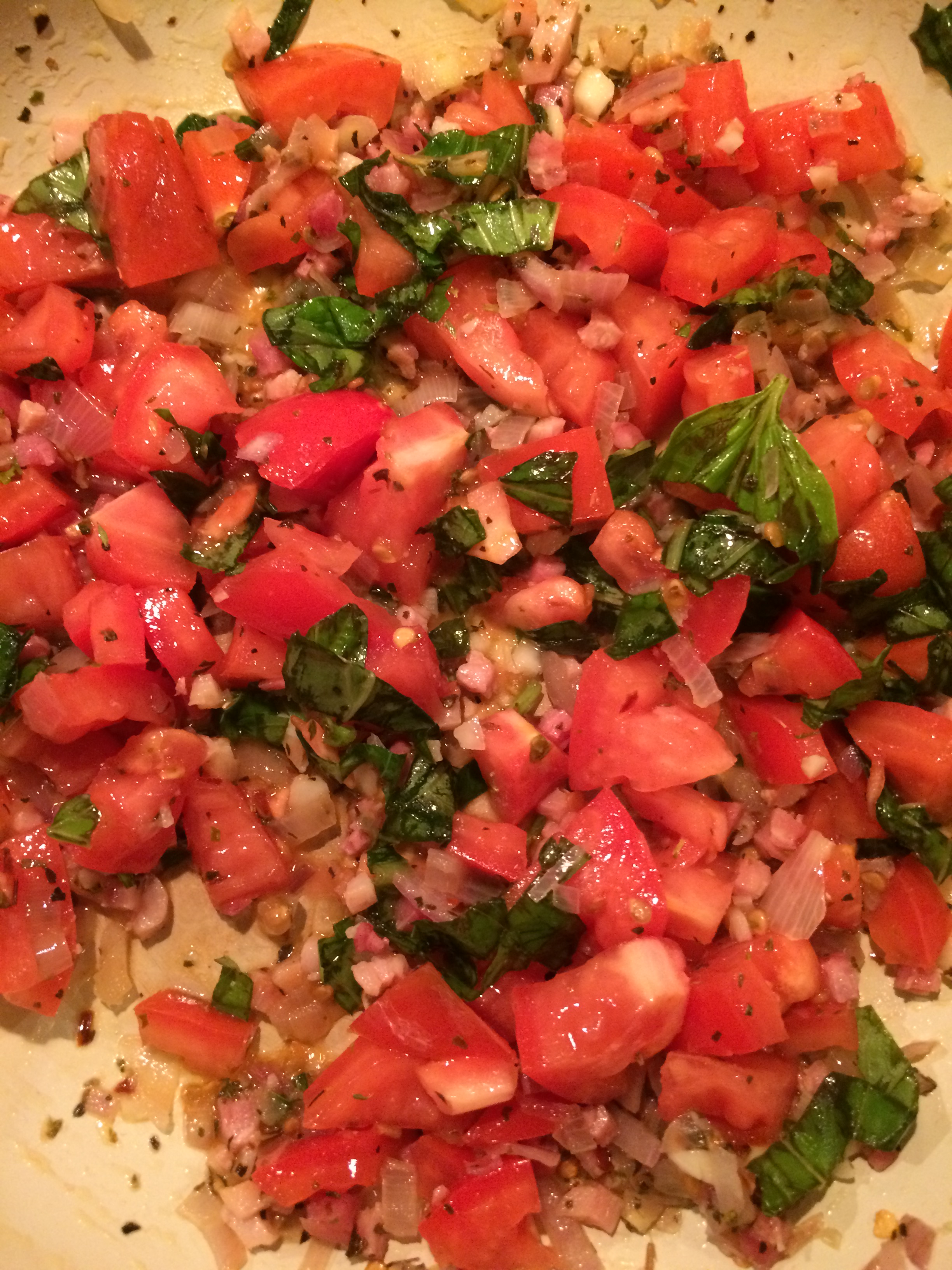 The base of this sauce is shallots and garlic cooked in the delicious drippings on pancetta – “italian bacon”, as it’s called – with tomatoes and basil. Pancetta’s a good meat to use when pairing with things like muscles because while flavorful and fatty in just the right way, it isn’t smokey, so the taste is subtle enough without overpowering your fish pairing.