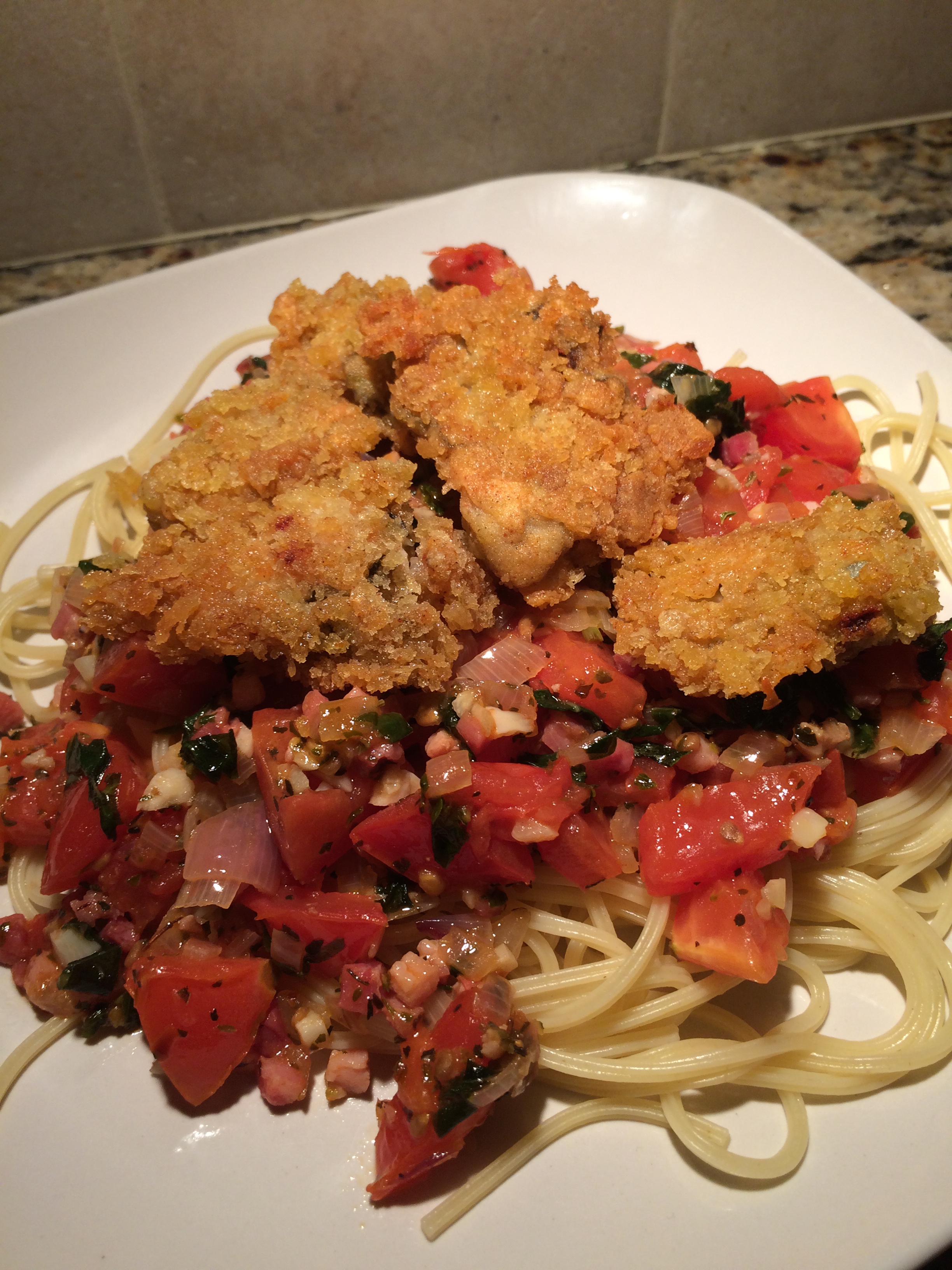 Begin by shucking oysters. Watch a video first, or give them to someone with knife and know-how. Place shucked oysters in milk to soak and set aside. Dice shallot and tomatoes. Mince garlic and roughly chop basil. Heat up 1 tbsp olive oil. Brown pancetta for a few minutes. Add in shallots and garlic. Cook a few minutes until shallots are tender. Mix in oregano, red pepper flakes, salt, and pepper. Cook for a minute. Add tomato and basil. Cook until tomatoes are soft. Set aside, and put on pasta water + salt to boil. Cook pasta to al dente while you fry the oysters. Mix flour, cayenne pepper, garlic powder, paprika, and salt. Remove oysters from milk. Dredge each oyster through ‘spicy flour’ then place in a skillet of olive oil pre-heated over medium-high heat. Fry a few minutes on each side until crisp, then top pasta with fra diovolo sauce and fried oysters. Enjoy!